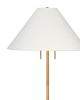 Warm and welcoming, this tropically inspired floor lamp blends ease, elegance, and lasting craftsmanship. A round of antiqued brass anchors the slender base, which transitions from warm metal to hand-wrapped rattan. Two bulbs nestle under a rami shade, allowing you to adjust the brightness with one pull or two. With its delicate proportions, this piece brightens a dim corner beautifully or sits perfectly between two chairs to create a cozy yet stylish nook.