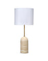 This handcrafted design was inspired by the elegance of the interiors Jamie experienced during travels through Italy, where travertine has been used since Roman times. No two pieces of the natural stone will be identical, and to highlight its beauty she chose a simple, softly curved bottle-shaped base. The warmth of the stone is accentuated by a long, slim neck and coordinating brass finial, both in gold. To keep the look clean and the focus on the travertine, she tops the lamp with a simple rolled edge drum shade in white linen.