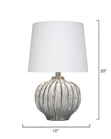 The softly rounded gourd-shaped base of this ceramic lamp is enhanced with layers of hand applied gray reactive glaze. Its cool palette is complemented by an off-white tapered shade in linen, silver-toned hardware, and a white ceramic ball finial. The overall effect is elegantly casual, making it an ideal choice for décor styles ranging from coastal to contemporary.