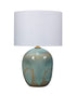 Multiple layers of reactive glaze are expertly applied by hand to the base of this stunning ceramic table lamp, utilizing blue, natural, and purple glazes to create a serene and slightly ethereal landscape. The round trapezoid finial and hardware are made of warm brass, and the drum shade is crafted from white linen. Fully artisan-crafted, each lamp is a work of art, and no two will be identical.