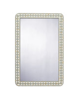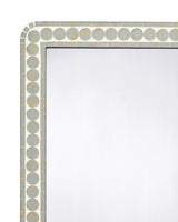 Soft sage tones and a gently distressed finish lend this handcrafted mirror an aura of quiet sophistication. Its painted glass frame, detailed with a subtle circular motif, captures and reflects light beautifully throughout the room. Perfect above a console, vanity, or dresser, it blends warmth, texture, and a hint of vintage glamour. Designed to complement both traditional and modern spaces, it evokes calm elegance.