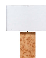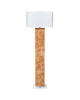 Magically melding natural burl wood with modern materials, this evocative floor lamp manages to be both modern and timeless. From top to bottom: a square cylinder acrylic finial, a white linen rectangle shade with softly rounded corners, and a burnished base that embraces the beauty of the natural wood. It all rests upon a rectangle of clear acrylic.