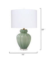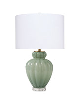 The softly undulating curves of this lamp's gourd-shaped base have been expertly crafted from hand-blown glass. Its easily integrated palette is enhanced by a linen shade and warm brass hardware. A crystal-clear acrylic finial and base bookend the design, updating the classic look and making it perfect for any classic yet comfortable decor.