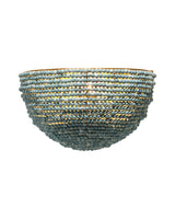 This decorative wall sconce shimmers with hand-carved blue mango wood beads, each individually finished so no two are alike, complemented by subtle brass highlights. Every detail is carefully crafted by skilled artisans. The layered texture and gentle illumination create a warm, inviting glow that feels both refined and timeless. Perfect beside a mirror, bed, or reading nook, it adds a touch of handcrafted artistry and quiet sophistication, enhancing any space with light, depth, and natural charm.