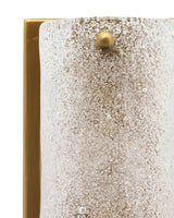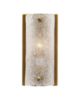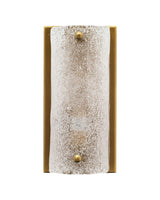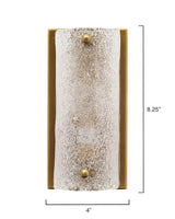 This clear decorative glass treatment feels like melted ice against an antique brass back plate. We have two sizes in this wall sconce. They can be placed in any room in the house and hang vertically or horizontally.