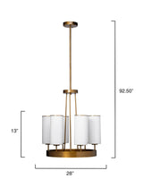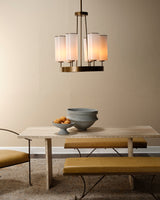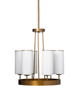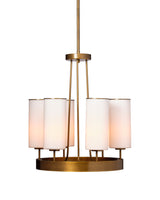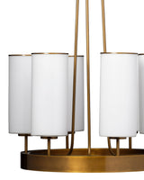 Six opaque white glass cylinders, each artisan handcrafted, float above an antiqued brass base in this sublime chandelier. They create an intensely diffused glow and soft, filtered, flattering light. Try above your dining table to make every meal a little more romantic! The exposed hardware and canopy are all antiqued brass, and professional installation is recommended.