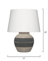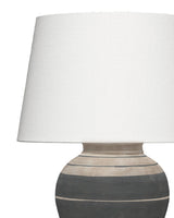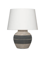 This beige and dark grey ceramic table lamp may be small in stature, but its alternating stripes add a bold touch to the body's antique pot shape. The coordinating tones of the body's finish combine to create a neutral earthy color palette that evokes a natural feeling of warmth with a modern touch. The petite size of this table lamp is perfect for an entry console or bedside tables.