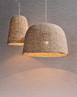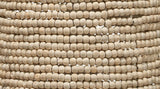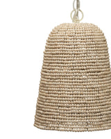 Strings of beads made with mango wood line the body of the oversized Canal Pendant. A white iron chain compliments the natural tone and texture of this piece. A statement piece with repeating patterns and textures like this can help add interest to any coastal palette.