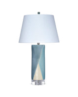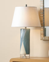 The feeling of calm created by looking at a single, puffy white cloud in a perfectly blue sky is evoked in this enchanting table lamp. The handcrafted ceramic body seems to float above its resin base, and the clever diamond design draws the eye up to a tapered shade in crisp, cool, white linen. A coordinating blue ceramic finial adds the final touch.
