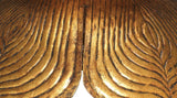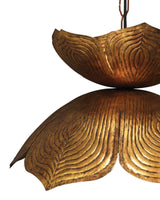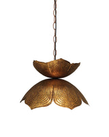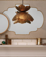 Shimmering and grand, this pendant light features a blooming lotus design that creates a stunning statement. Made of metal and finished in a rich, antique gold that gleams when illuminated.
