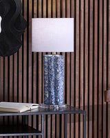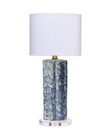 The scalloped body of this ceramic lamp is finished with reactive glazes that have been expertly fired to create vibrant patterns, masterfully updating the traditional blue and white color scheme. A thick slice of crystal-clear resin grounds the design, which is topped with an oval shade in white linen. We love this displayed as a pair on a mantle.