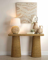 Inspired by a warm, Hawaiian summer breeze, this table lamp will add a relaxed yet elevated atmosphere to your home. The lamp's body is a sphere formed by woven corn rope, and it's topped with a cream linen shade and matching corn rope finial. Expertly handcrafted of natural material, the crisscrossed openwork weaving adds texture and fresh style to any setting.
