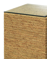 From the Captain collection of home accent furniture. Created with sea and sand and salt in mind, the collection was inspired by Jaime’s travels to coastal paradises across the globe. Each piece is artisan crafted from sustainably harvested seagrass and topped with a strong slab of tempered glass. The intrinsic beauty of the natural material is allowed to take center stage, and flaws in the organic material are not only celebrated but considered an integral part of the design.