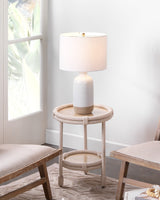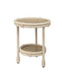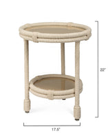 This accent table was created with nautical white rope and rattan lined shelves to evoke a coastal lifestyle.