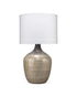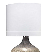 The metallic elegance of the Damsel Table Lamp cannot be overlooked. Its metallic glass texture gives it a luxurious, multifaceted appearance. This oversized statement piece has a voluptuous silhouette with a lightweight and shimmery texture.