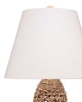 Inspired by a warm, Hawaiian summer breeze, this table lamp will add a relaxed yet elevated atmosphere to your home. The alternating woven pattern adds interest to the body's rounded cone-like shape, with a matching corn rope finial topping a white linen shade. Expertly handcrafted of natural material, the crisscrossed openwork weaving adds texture and fresh style to any setting.