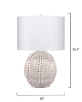 The perforated patterns on the curved and dimpled base of this table lamp reflect Jaime’s interpretation of the craters, mountains, and seas of the lunar landscape. While the design’s celestial inspirations are subtle, the look is not! The bold and decorative patterns are created one-at-a-time by talented artisans. Each lamp is topped with a linen rolled-edge drum shade in white and an acrylic ball finial; the sockets and 3-way turn knobs are silver. The Lunar lamp is available in your choice of Matte Black or Matte White. No two will be identical.