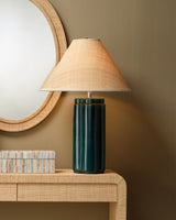 Inspired by the mesmerizing ripples that trail sailboats in the sea, the softly undulating curves of this table lamp's base are finished in a stunning reactive blue-green glaze. A linen-trimmed raffia cone shade enhances the coastal feel, and a coordinating metal finial and gold-toned hardware elevate the entirety.