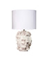 Beautifully handcrafted of cornflower blue ceramic or white ceramic, this showstopper of a table lamp is a riot of rich texture. To balance the free and bold shape of the base, we pair it with a simple white linen drum shade and a coordinating finial, harp, and spider in cornflower blue or white resin.