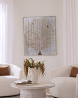 A luminous tree of life unfurls in gold, sheltering birds of every hue in this striking wall piece inspired by a spiritual symbol shared across cultures. Each design is meticulously crafted by artisans on the reverse of antiqued glass, a process that creates rich dimension and a softly weathered shimmer. Variations in tone are inherent to the technique and can be pronounced, making every mirror distinctly one of a kind. Radiant and layered, this artwork evokes both the beauty of nature and the enduring spirit of connection and renewal.