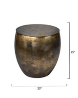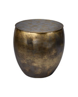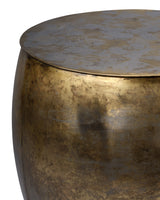 Hand-forged metal finished in antique brass gives this tall drum side table a luminous patina that captures light with subtle radiance. Its sculptural form and layered metallic tones introduce depth and sophistication to any room. Whether styled beside a sofa or as a stand-alone statement, this versatile piece pairs beautifully with warm woods, soft textiles, and rich finishes for a refined, artful look.