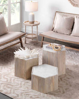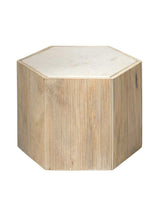 Simple, yet stunning our Argan Hexagon tables use a ribbed washed wood and white marble to create a brilliant side table that is light in feeling but large in size, perfect for any airy living room.