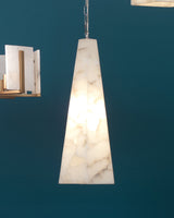 Generously proportioned and elegantly tapered pearlescent alabaster pendant.