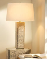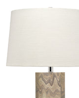 Inspired by the layered strata found inside American canyons, this table lamp features a handcrafted grey-sand wood veneer base complemented by nickel hardware. A cloud-like tapered white-linen drum shade softens and diffuses the light beautifully. The natural palette and versatile proportions make it equally suited for a console, dresser, or side table, providing both functional illumination and an accent that enhances any space elegantly.