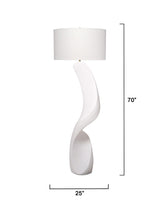 This breathtaking lamp’s sculptural base features an abstract swoop that sinuously rises from the earth, embracing and obscuring its internal hardware. The eye is drawn upward to a white linen drum shade floating serenely above it all. Formed from ricestone—a unique substance that combines natural quartz crystal with resin—it creates a dramatic look that enhances décors from contemporary to coastal.