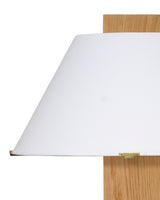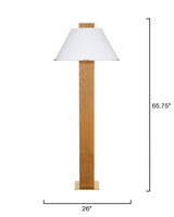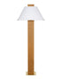 Anchoring a room with substance and presence, this artisan-hewn floor lamp rises from a hand-carved oak base set on a square of brushed brass. A visible armature mirrors that flash of warmth, while an oversized oak finial and a white linen cone shade complete the composition and softly diffuse the light. This lamp looks magnificent beside a leather sofa or in an entryway.