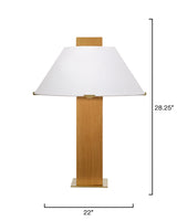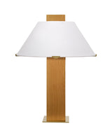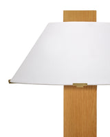 A substantial presence capable of anchoring a room, this artisan-hewn table lamp rises from a hand-carved oak base set atop a brushed-brass square. A visible armature mirrors the warmth of the wood, while an oversized oak finial and a white linen cone shade complete the silhouette and softly diffuse the light. It looks magnificent beside a leather sofa or in an entryway.