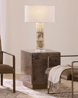 Artisans craft these tables using highly glossed natural goat vellum, a rare and strong parchment-like material prized for its beauty. Each piece displays variations in color and shading, making every table unique. The soft neutral tones, paired with a brass-finished base and versatile scale, allow these accents to integrate into any décor. Use them individually or group them to form a stylish, elegant, and functional display that enhances the room’s aesthetic.