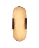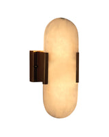 Accented with rich antique brass metal, a sleek pane of alabaster floats in front of the wall to fully illuminate the unique veining inherent in all alabaster stone, creating lovely, subtle striations that move throughout sconce.