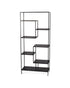 Black metal shelves and supports are asymmetrically arranged to create the perfect open-work etagere. Finished on all sides, this piece makes a great room divider. Use two of these shelving units side-by-side to create a larger piece that is the perfect reflection of itself and twice as large!