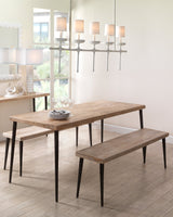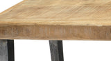 Farmhouse style hand-worked, dark wood table-tops elegantly pair with modern, hammered antique silver legs adding the perfect touch of drama to this table collection.