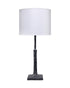 The Humble Desk Lamp is a slender tabletop lamp made from polyresin plaster with a textured charcoal finish. The richly textured base of the lamp lends it a hand-done appeal, and its white linen drum shade and coordinating finial add refinement.