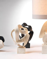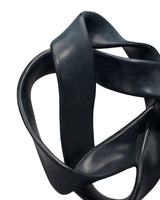 This organically shaped object is placed on a museum worthy stand to elevate substantial straps of black resin that wrap and twist around a center void, creating a piece full of smooth curves and visual interest. A beguiling addition to a stack of books or coffee table curation, it is an unexpectedly intriguing accent ideal for any modern décor.