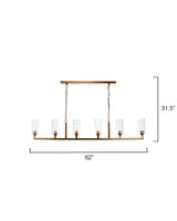 The stylish angles of the Linear 6 Light Chandelier provide a warm illumination that highlights any bar, counter or dining room elegantly. This hanging fixture modernizes the classic vintage torchier with clear glass shades and metallic chain link hardware.