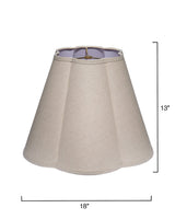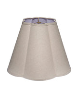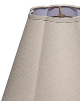 Offered in a selection of sizes and fabrics, this collection of tapered shades is distinguished by a softly scalloped shape that adds interest, femininity, and a generous splash of style. Shown here in a natural-on-natural palette, each linen shade has been artisan crafted and trimmed by hand. A gold-toned harp and a brass spider are included.