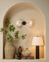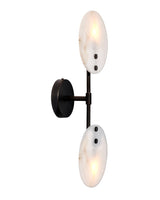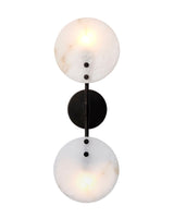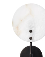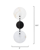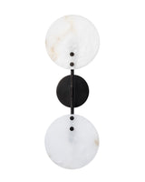 Hand-carved discs of natural, creamy white alabaster orbit a bronze back plate in this ode to mid-century futurism. The natural stone softly diffuses the bulbs, and when lit the organic beauty and individual characteristics of each piece is revealed. Try two vertically framing a mirror, or three installed horizontally to lighten up an otherwise dull hallway. No two will be alike.