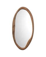 An imperfect oval shape in a natural wood finish creates an unexpected mirror that embraces its organic nature. The variance in the wood frame harkens back to the untamed nature of real trees, embracing the unique imperfections that make it perfect.