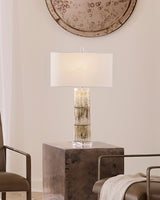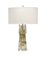 Artisans craft each table lamp from hand-selected pieces of natural horn combined with crystal-clear acrylic, making every piece truly one-of-a-kind. An off-white linen oval shade tops the lamp, diffusing light softly. Use a pair on an entryway console or position them on side tables in a bedroom for a coordinated, sophisticated look. The materials and craftsmanship make these lamps distinctive functional art.