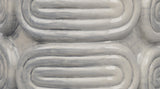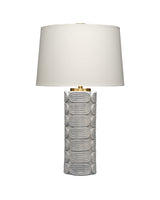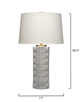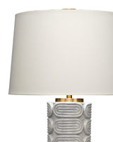 Repeating geometric patterns in ceramic are accented with hand applied drip glazes in a soft blue to create the richly layered and textured base of this modern table lamp. Antique brass hardware and a trapezoidal finial compliment the look, and a creamy white linen drum shade tops it all to perfection. Finely crafted, this striking lamp will be loved for life.